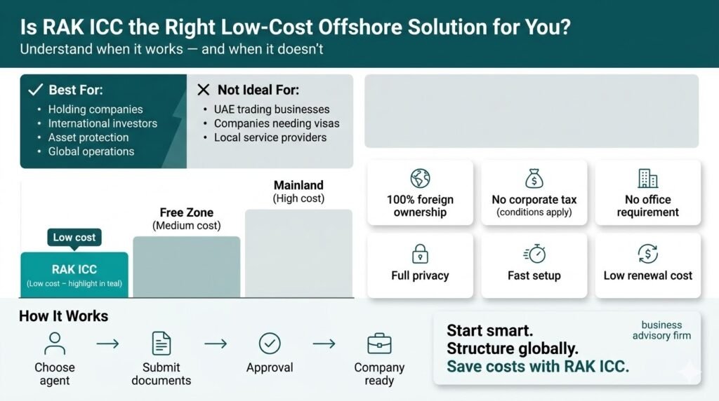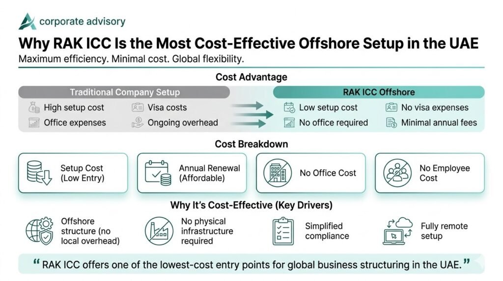 A RAK ICC company is the ultimate tool for the cost-conscious yet strategically minded entrepreneur. It delivers the prestige of a UAE-registered structure without the overhead of a physical office, local staff, or excessive compliance burdens all at a fraction of the cost of comparable jurisdictions.